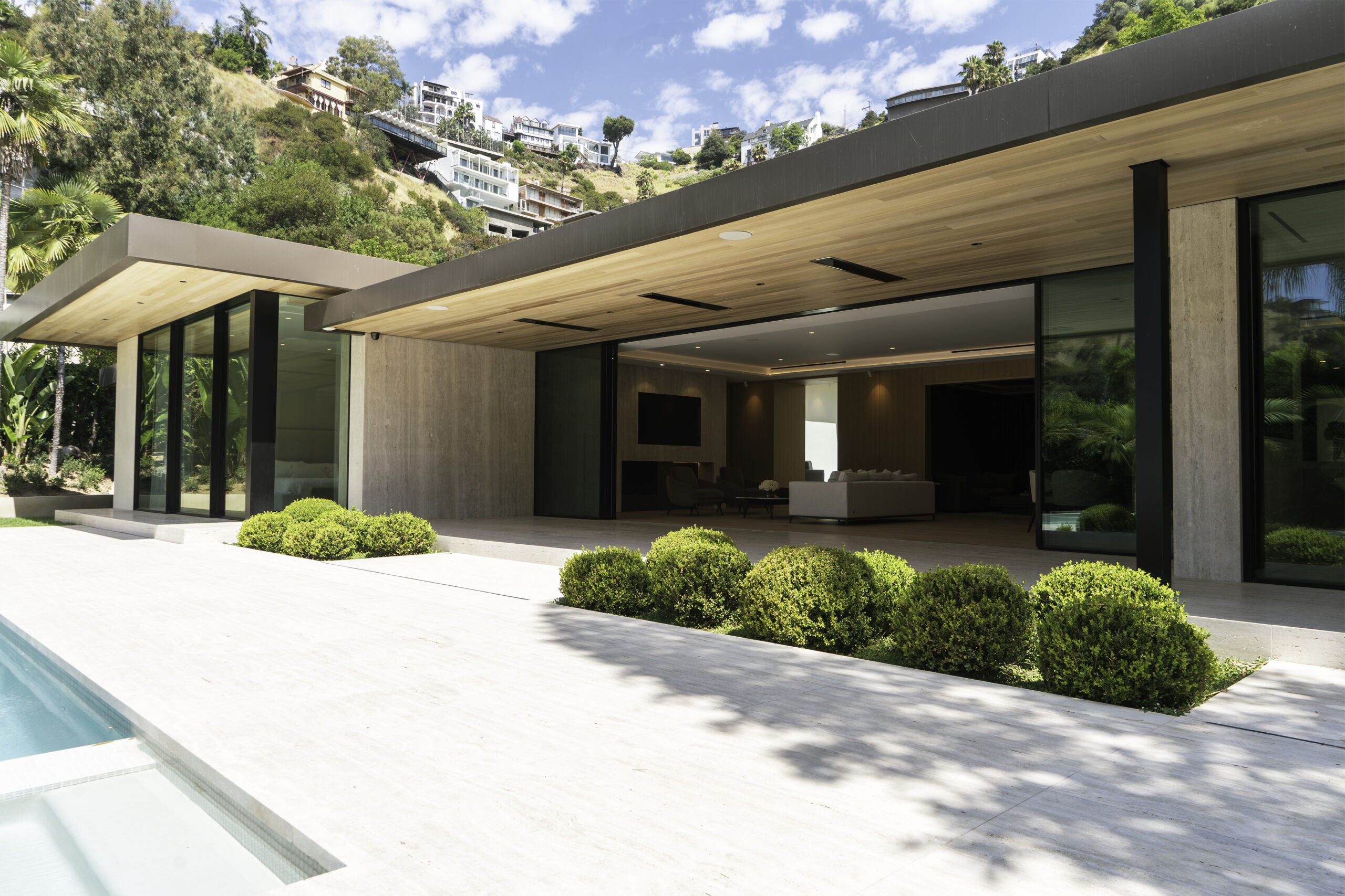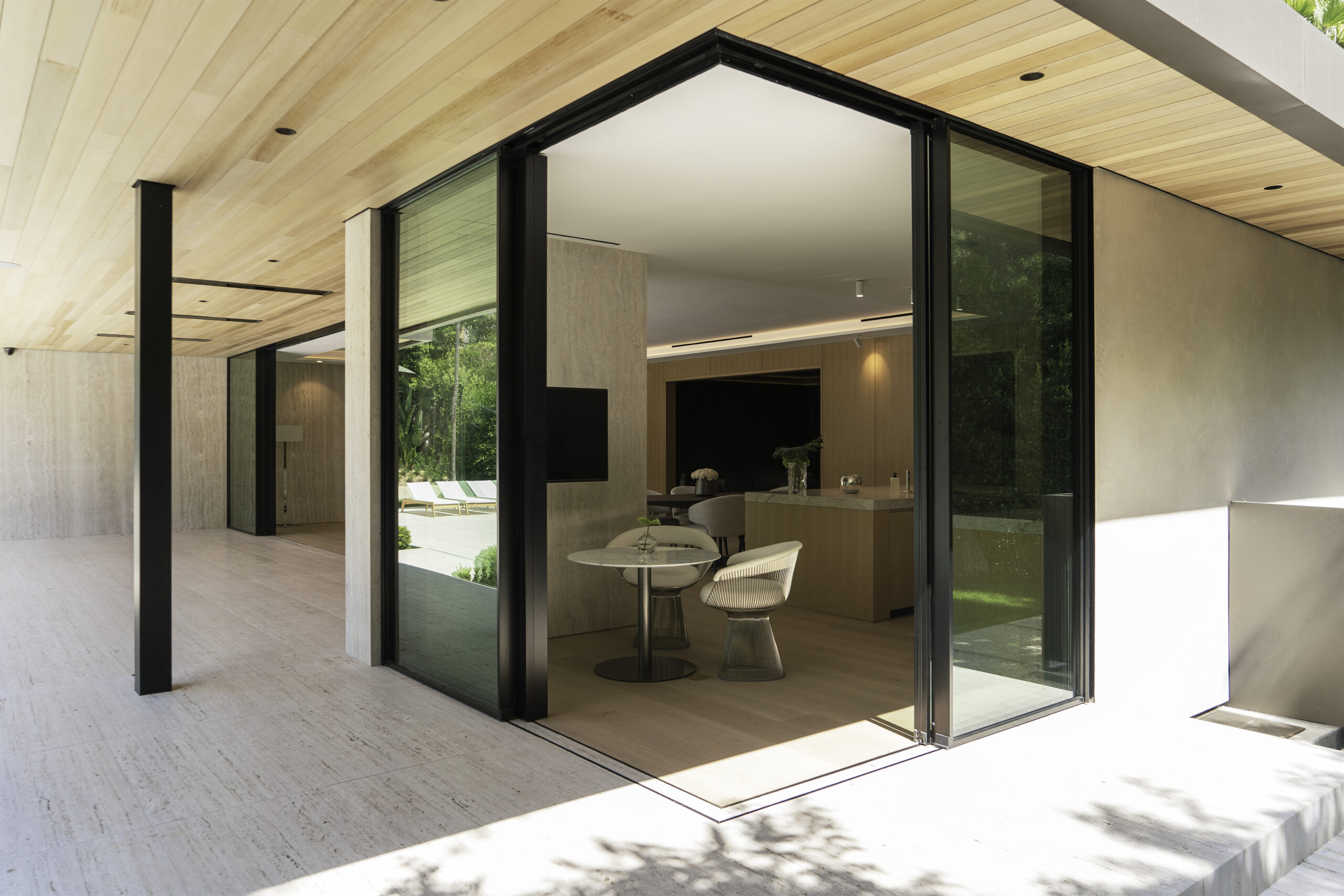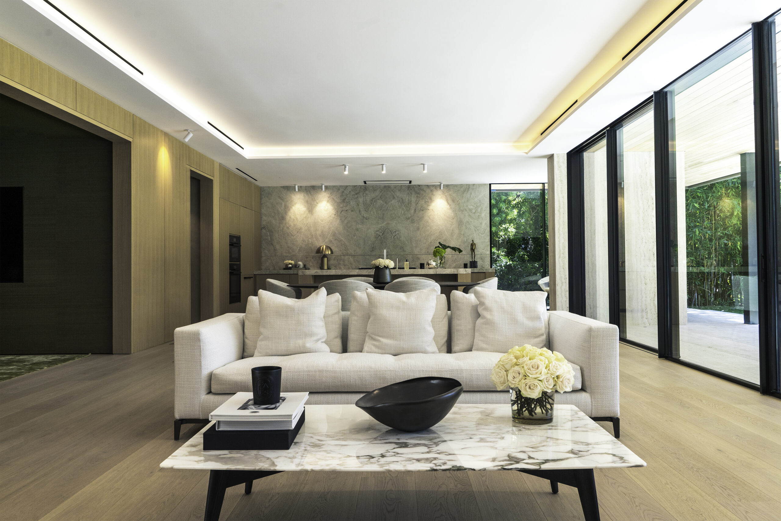 This minimal home’s luxurious subtlety subscribes to the notion that less truly is more. Wood, stone, and golden finish details create intentional flush profiles to maximize open space and straight lines. The rear exterior features wall to wall glass and corner-openings revealing a peaceful, secluded poolside.