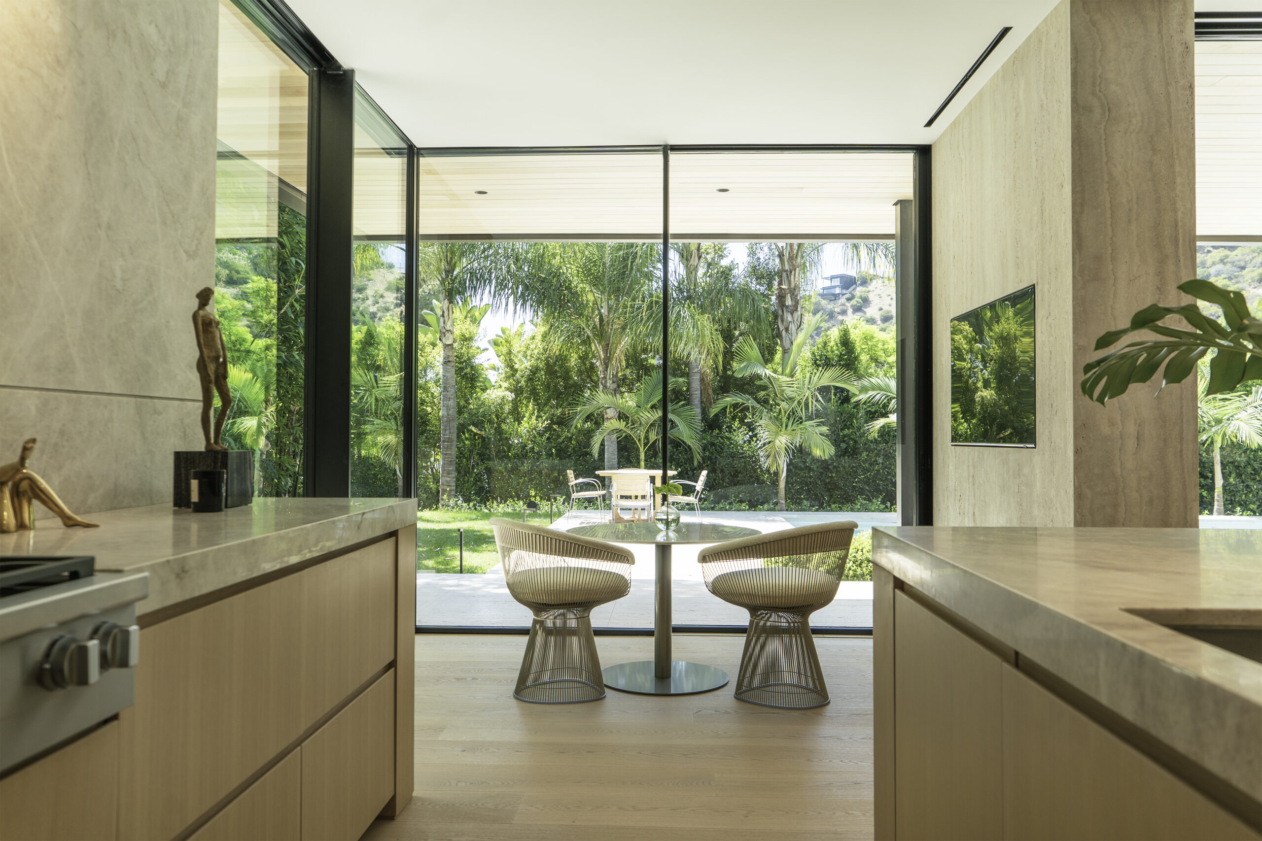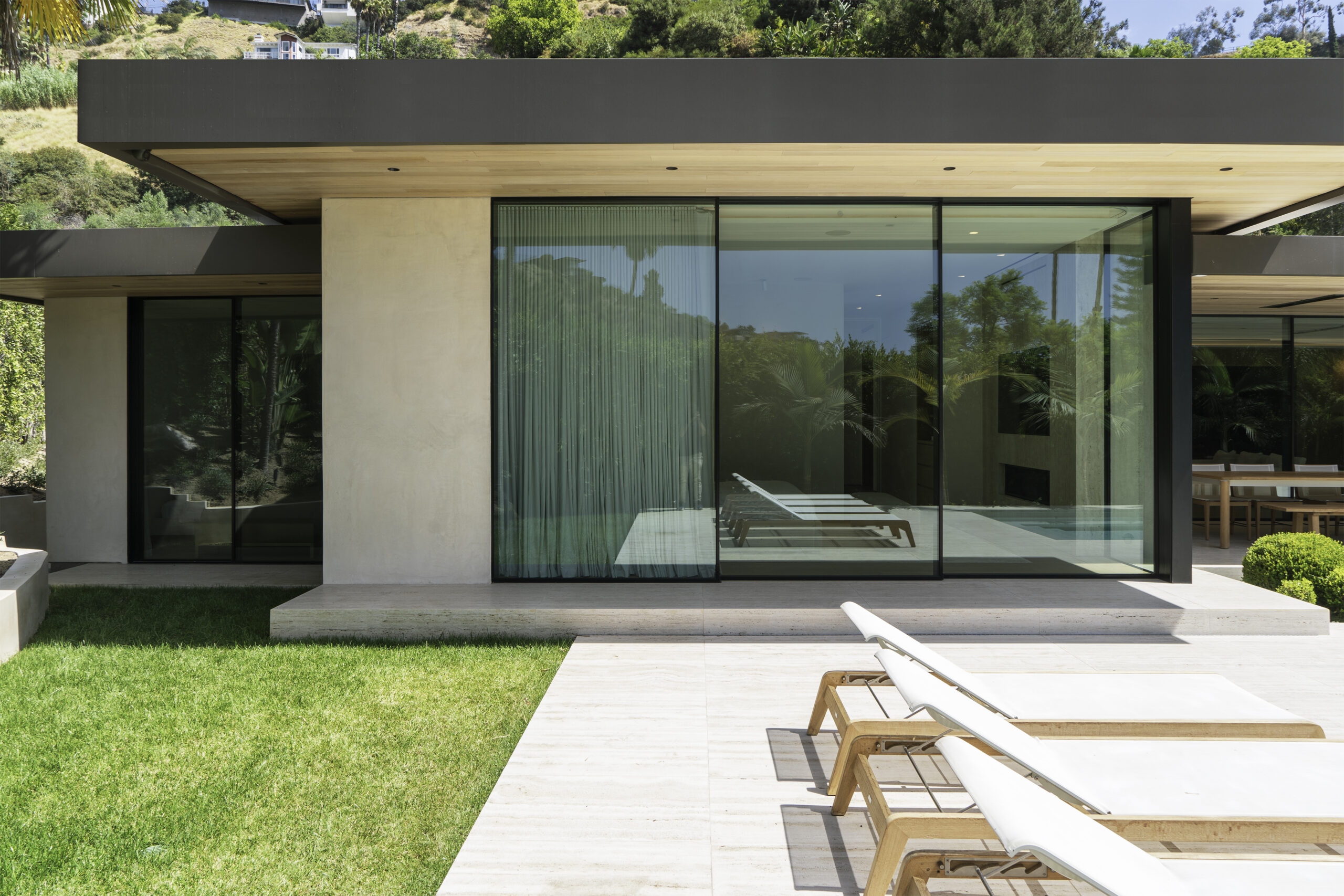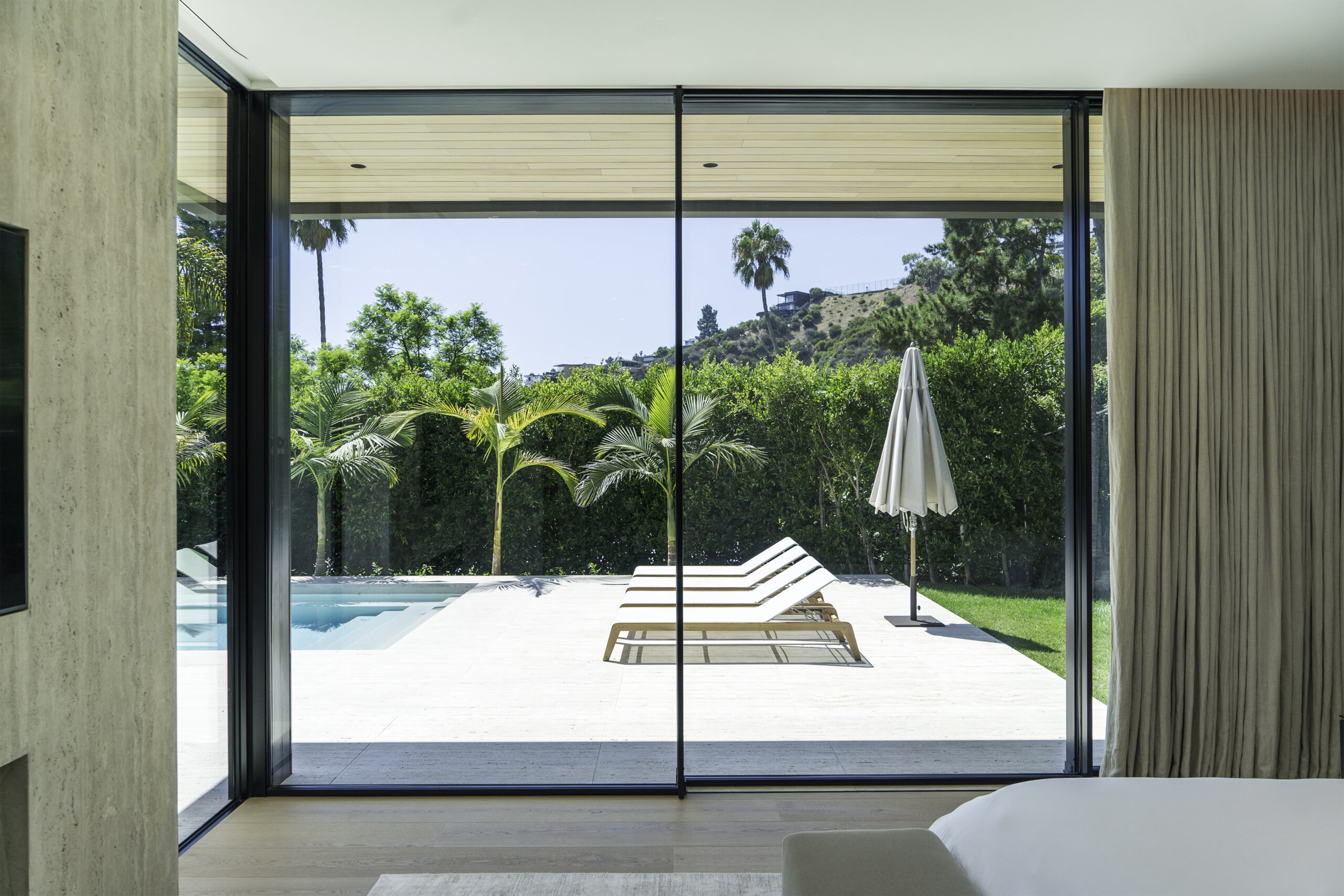 This minimal home’s luxurious subtlety subscribes to the notion that less truly is more. Wood, stone, and golden finish details create intentional flush profiles to maximize open space and straight lines. The rear exterior features wall to wall glass and corner-openings revealing a peaceful, secluded poolside.