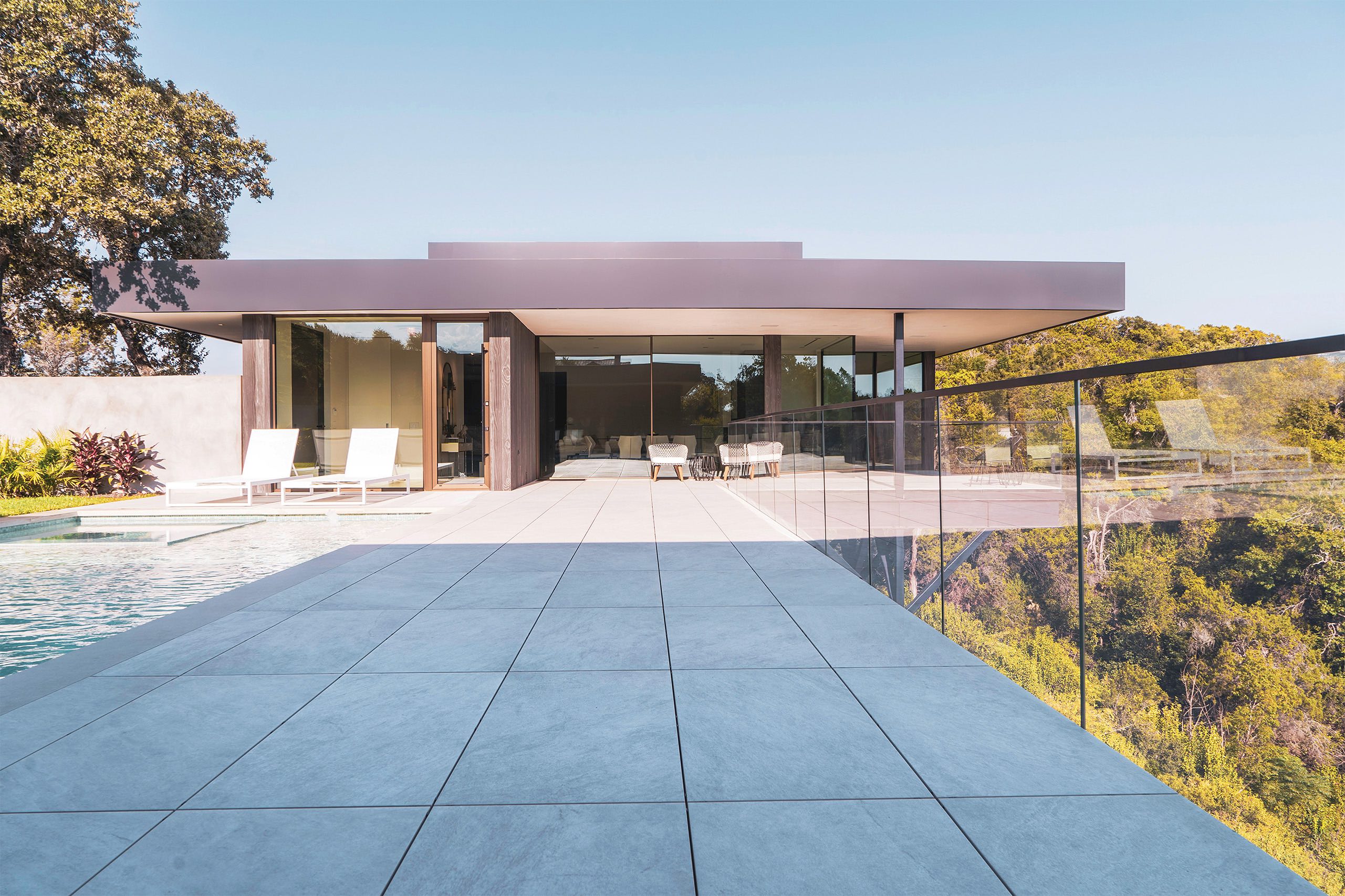 Towering glass walls traced in metallic bronze overlook the rolling Austin hills from this picturesque, modern oasis. Winn Wittman’s challenge to the role of glass in a home removes boundaries of movement and view in a stunning, rectilinear fashion.
